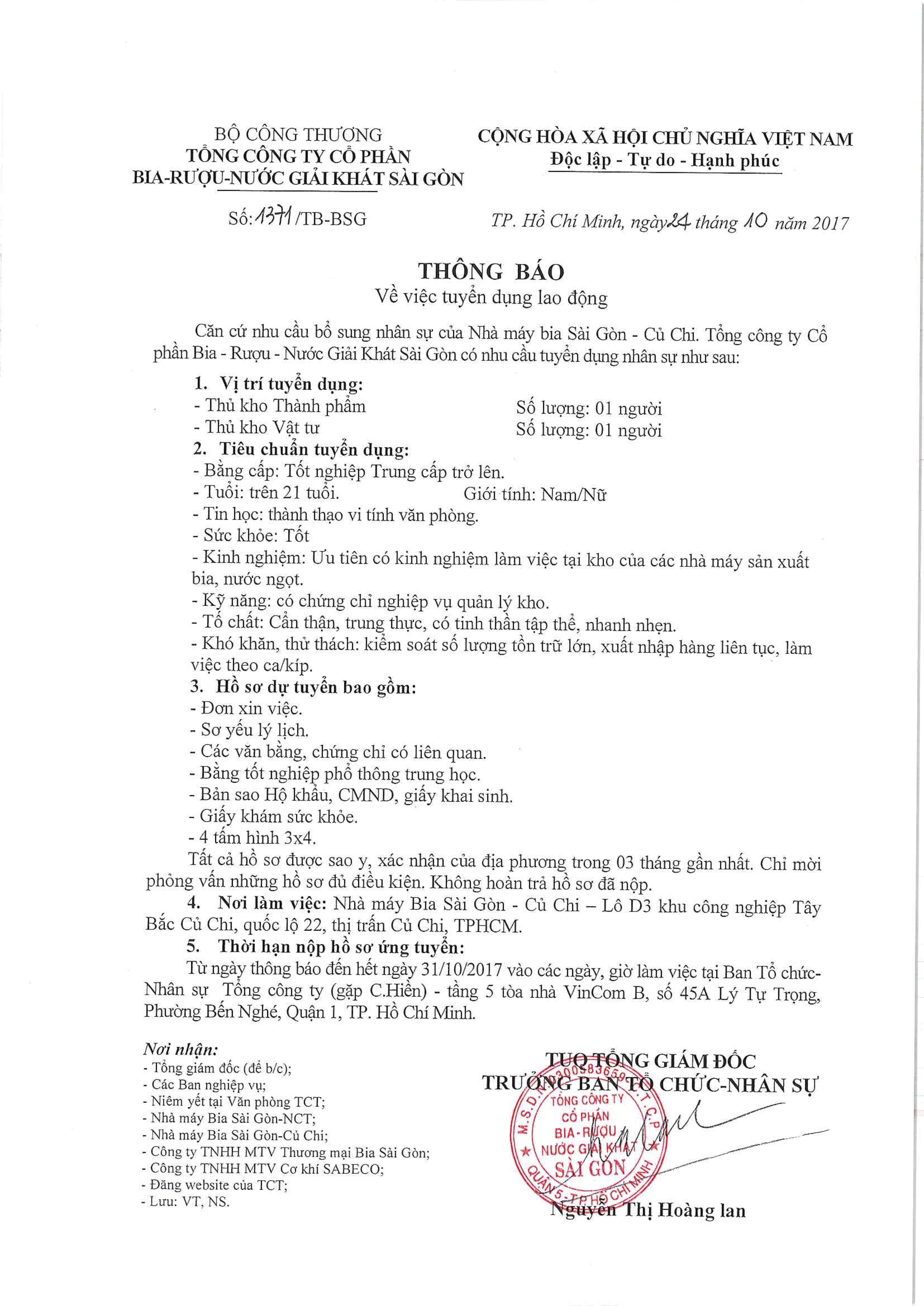 Thủ kho Vật tư cho NM Bia Củ Chi